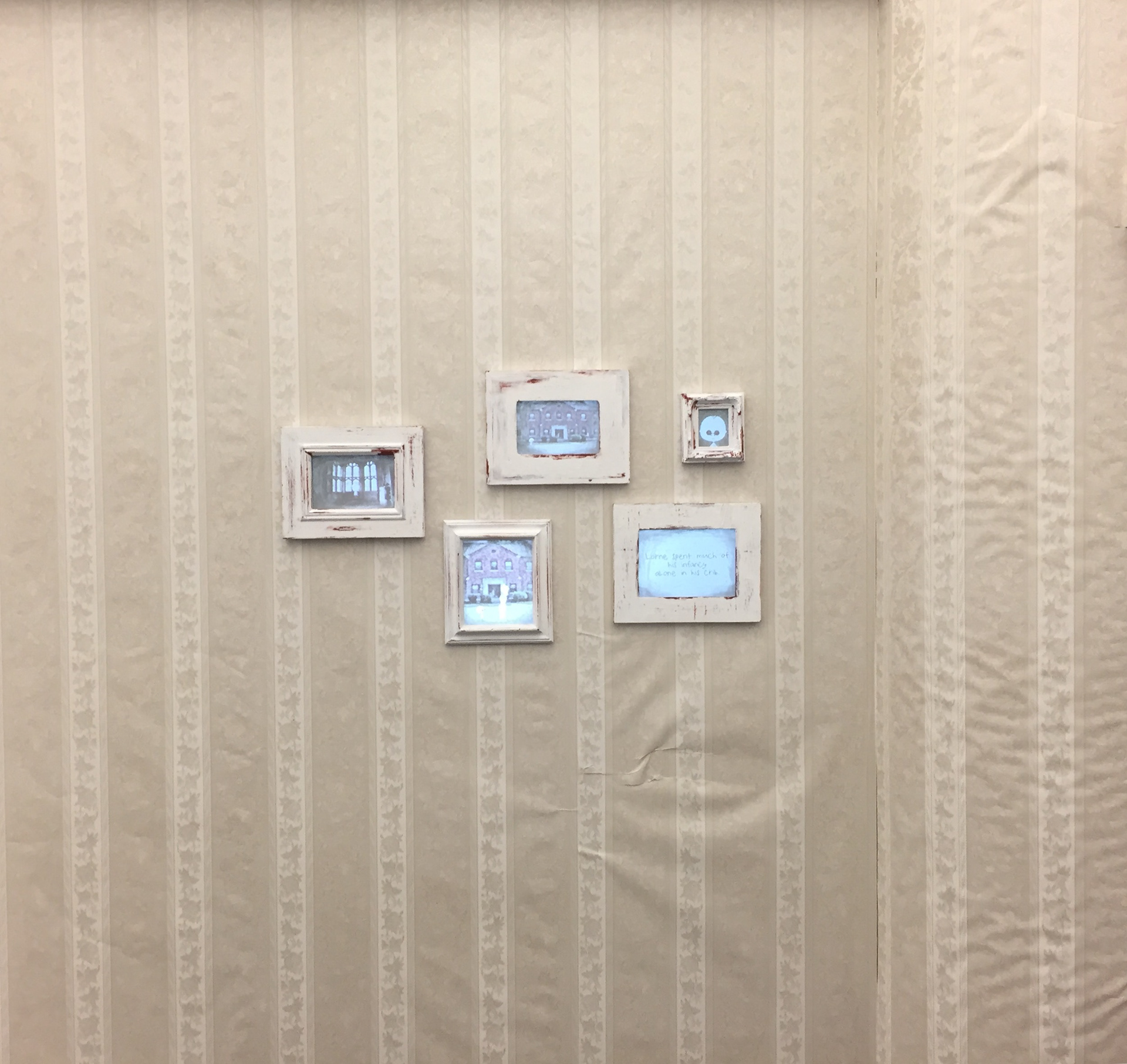 The installation presents Lorne’s life as a series of framed memories. Each frame functions as a moment in time, small, incomplete, and quiet, mirroring the way trauma and isolation fragment personal memory.