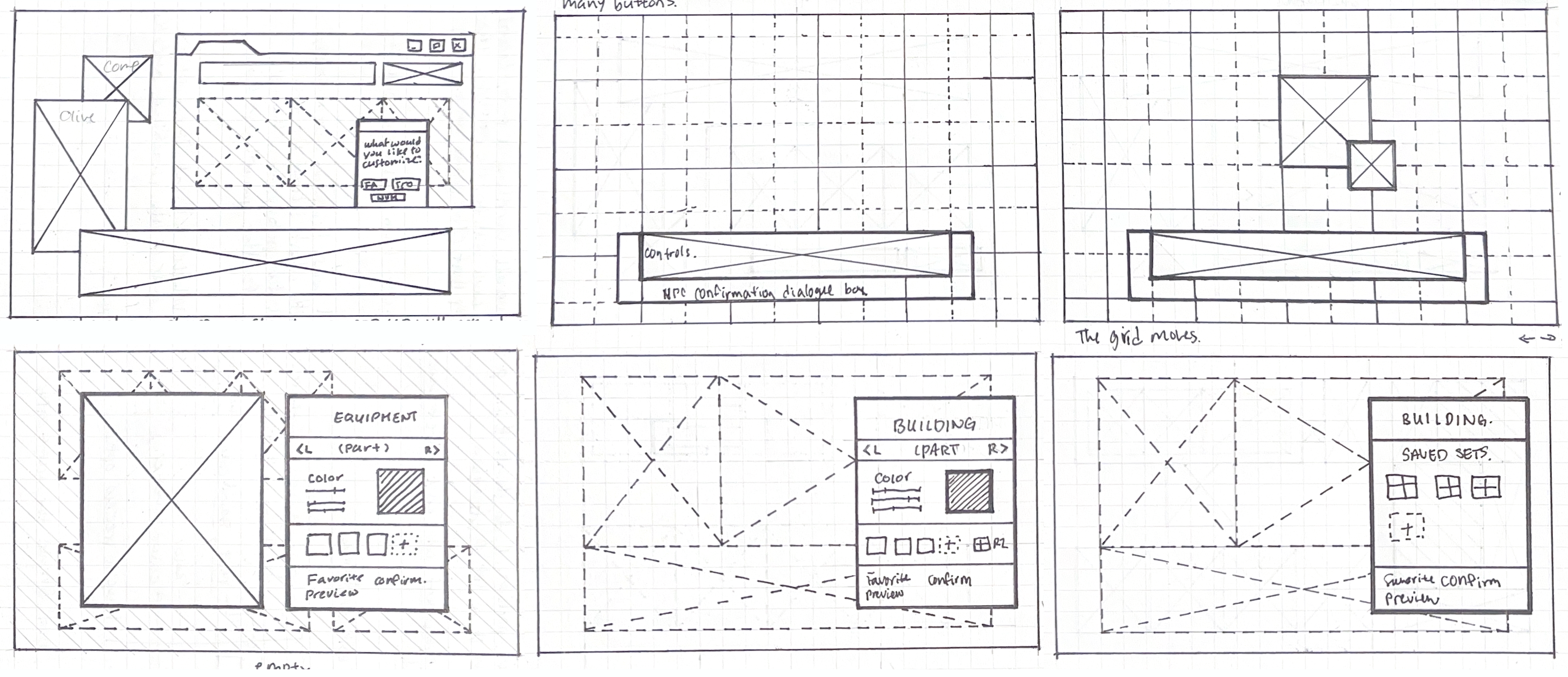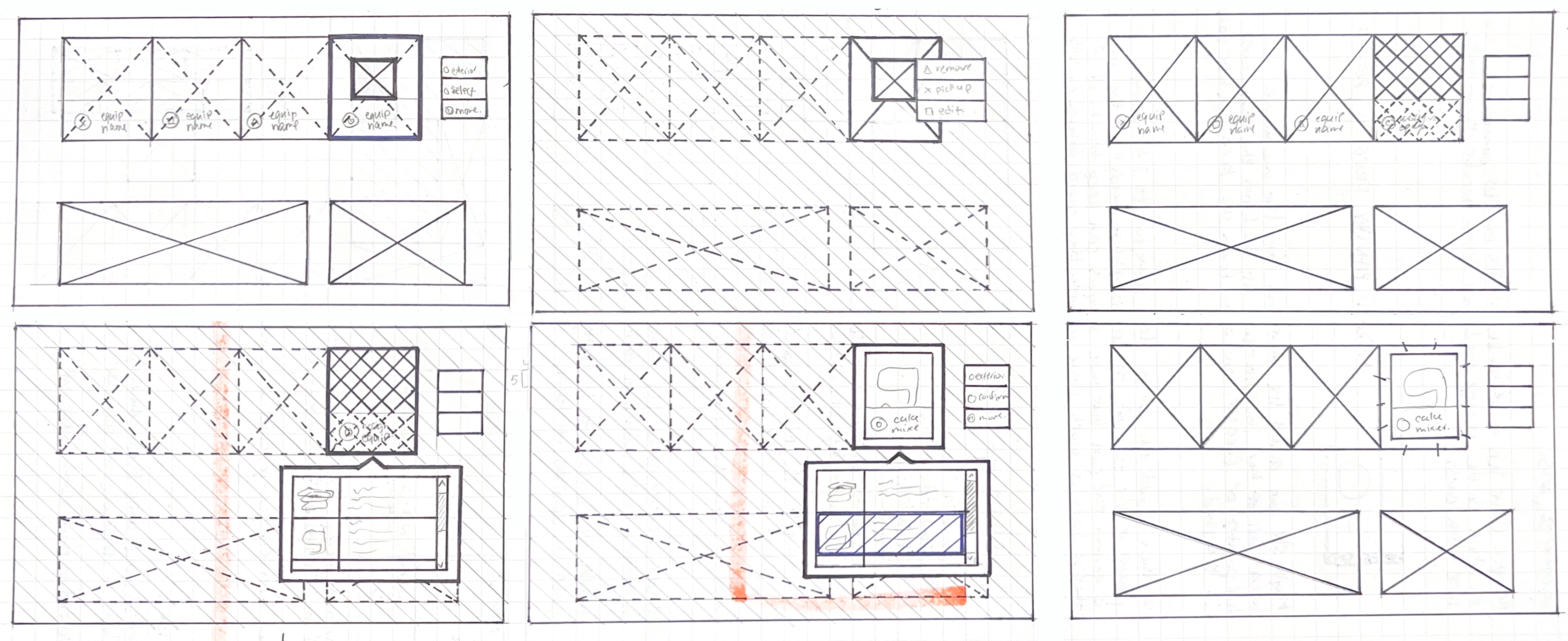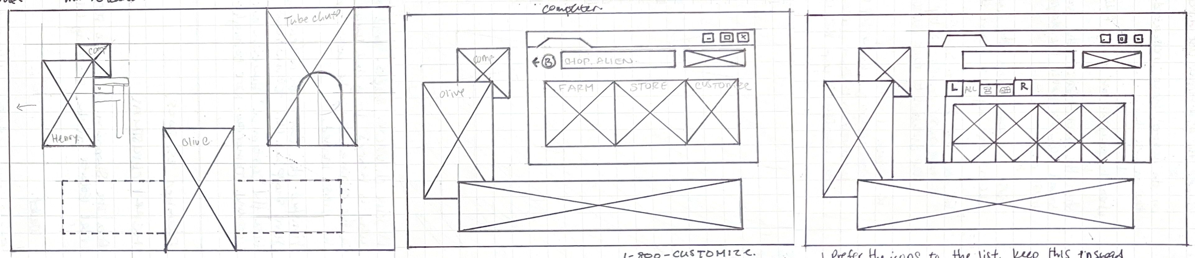 Early layouts crowded the screen and minimized Olive’s presence. Splitting equipment across both sides improved spatial balance.