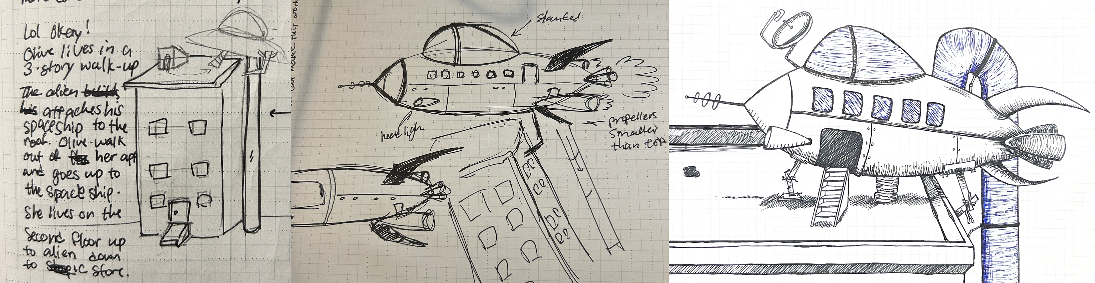 Henry’s spaceship was moved from an early concept of being parked in Olive’s yard to the roof of her urban apartment building. This change better reflects Olive’s financial reality and clarifies the spatial relationship between key locations.